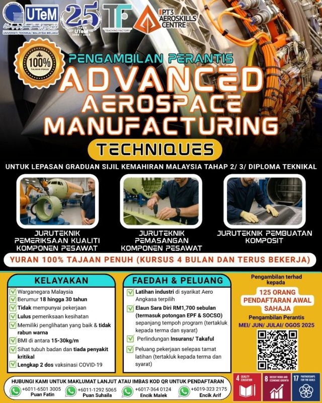 PT3 Consultant Sdn. Bhd., in collaboration with Teaching Factory UTeM, is seeking apprentices for the “Advanced Aerospace Manufacturing Techniques” program. Conducted in a real industry environment with state-of-the-art facilities, this program equips participants with hands-on aerospace manufacturing skills to prepare them for local and international industry opportunities.