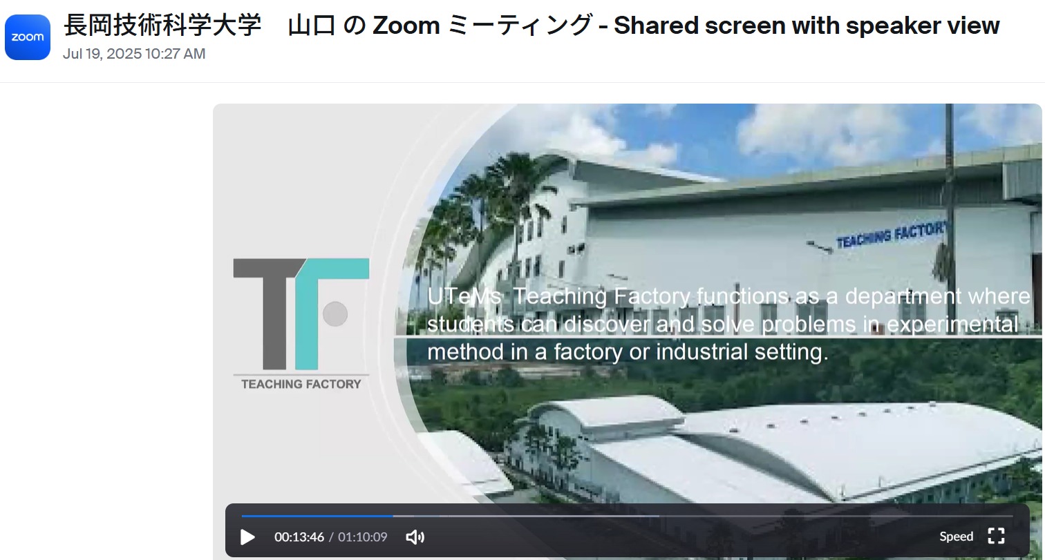Teaching Factory UTeM expanded its global visibility when two of its managers represented the university on international platforms. Prof. Madya Ts. Dr. Norfariza Ab Wahab, Quality Control Manager, delivered an online introduction of UTeM and TF to lecturers and students at Nagaoka University of Technology, Japan on 19th July 2025.