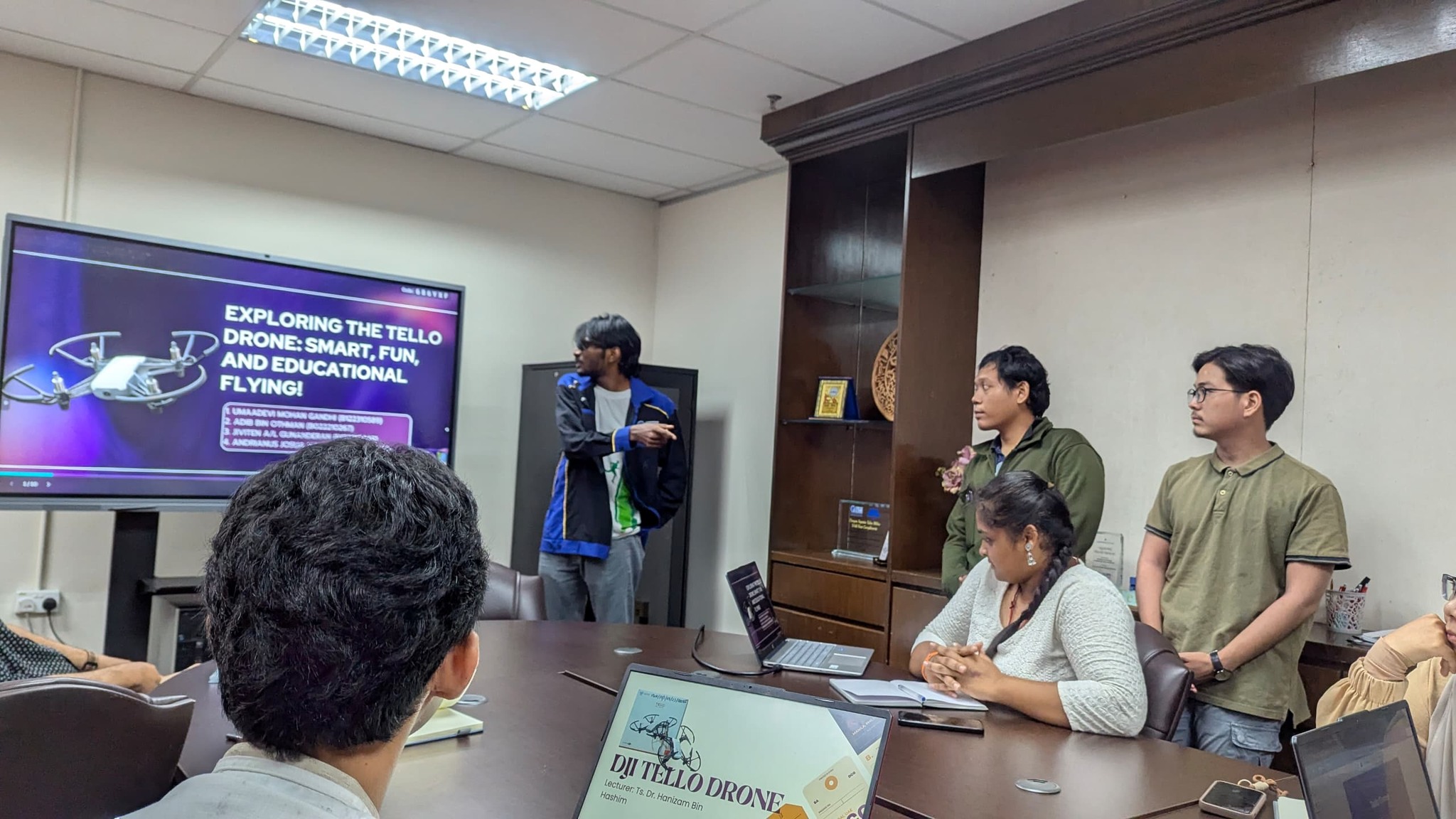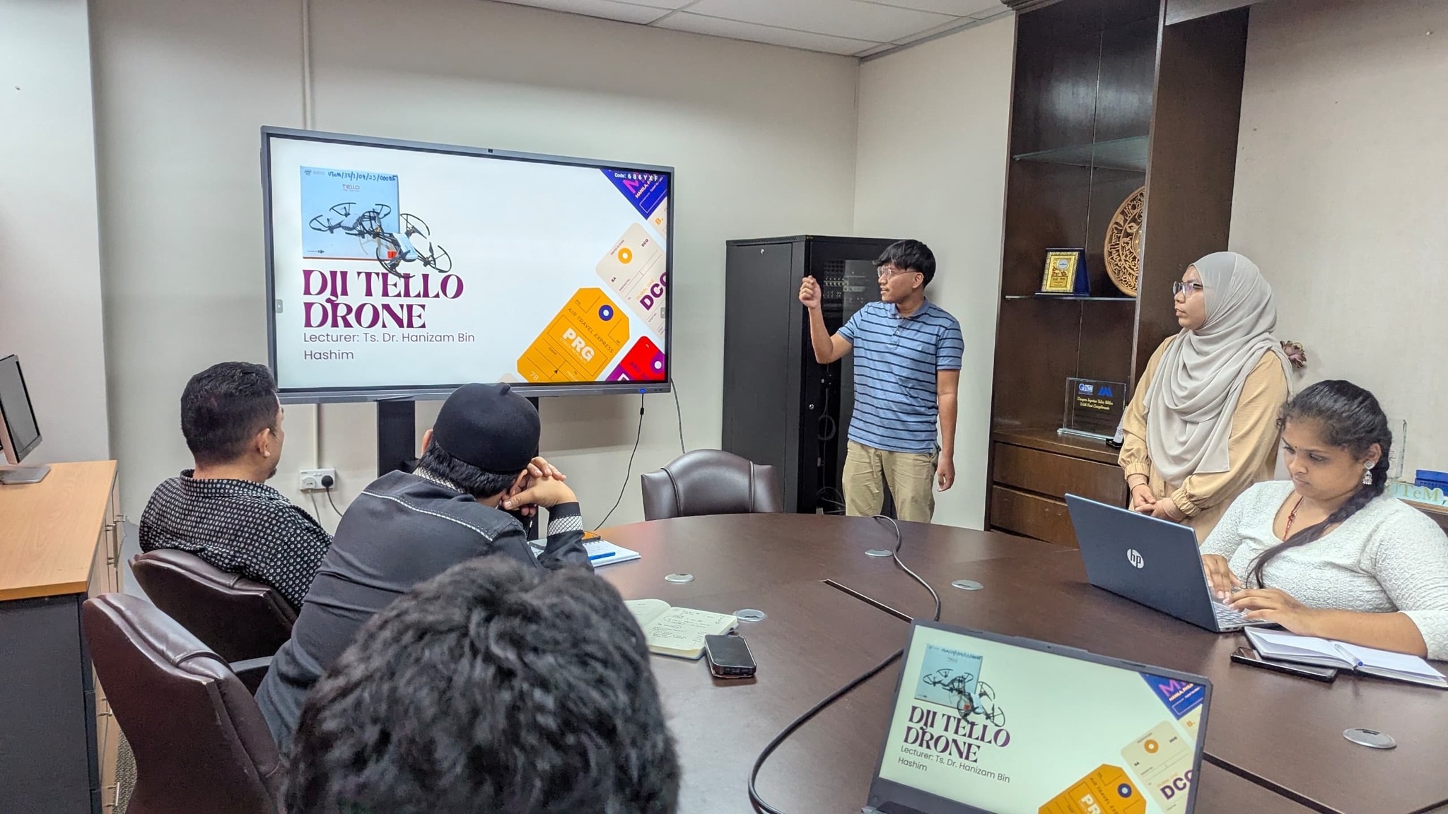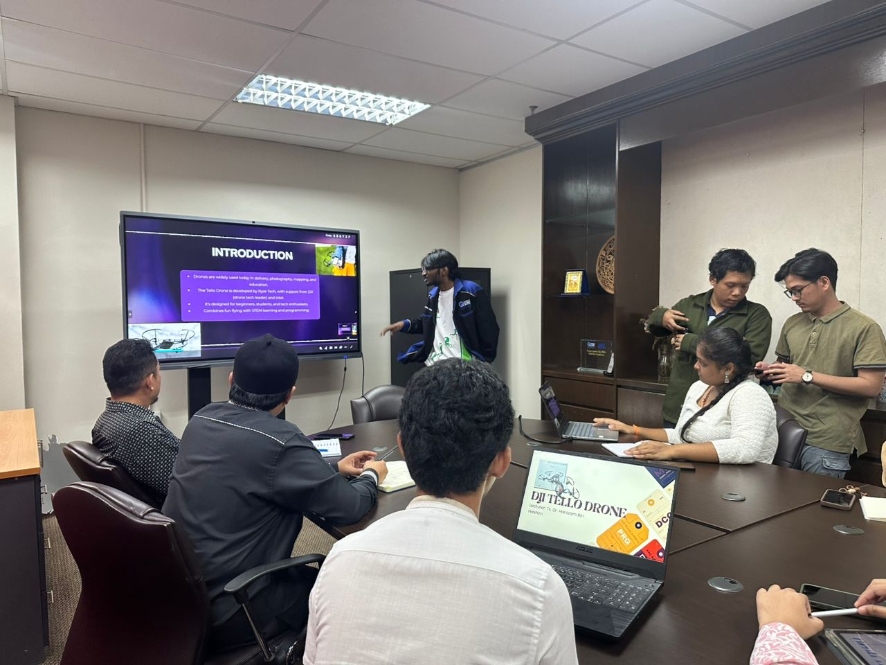 Teaching Factory UTeM hosted a session featuring presentations from UTeM and Institut Teknologi Sumatera (ITERA) industrial training students on their assigned projects. The first presentation covered their hands-on experience with Tello Drones and simulation training under the guidance of Ts. Dr. Hanizam Hashim, followed by practical demonstrations of their drone control skills. The second presentation by Dr. Isma Addi Jumbri introduced students to the 7P’s of marketing and entrepreneurship which are Product, Price, Place, Promotion, People, Process, and Physical as applicable to their industry roles. The meeting also outlined task assignments for welcoming guests from Universitas Islam Bandung (UNISBA), Indonesia, who will participate in a mobility program and drone training at TF from 29–31 July 2025.